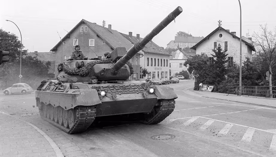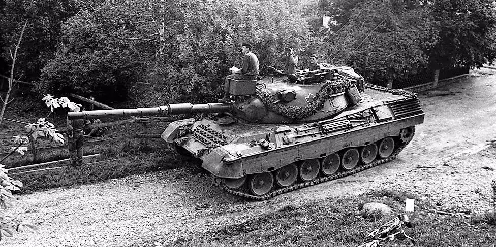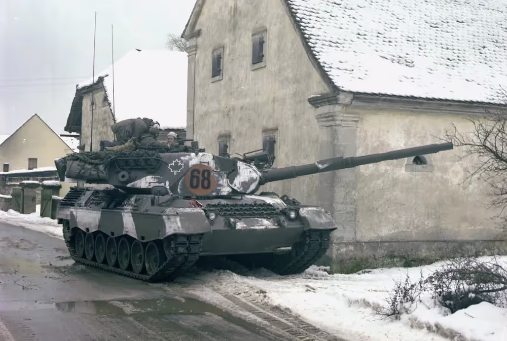 Fallex 77, 4 CMBG RCD Leopard tank on the move during Ex Carbon Edge as German civilians look on in a German town, September 1977. This is one of the early Leopards rented from the German government until the Canadian models were produced.