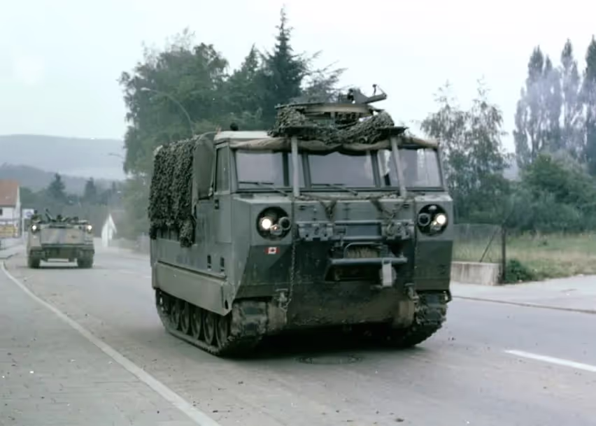 Fallex 77, M548 passing and an M113 APC passing through a German town, Sep 1977.