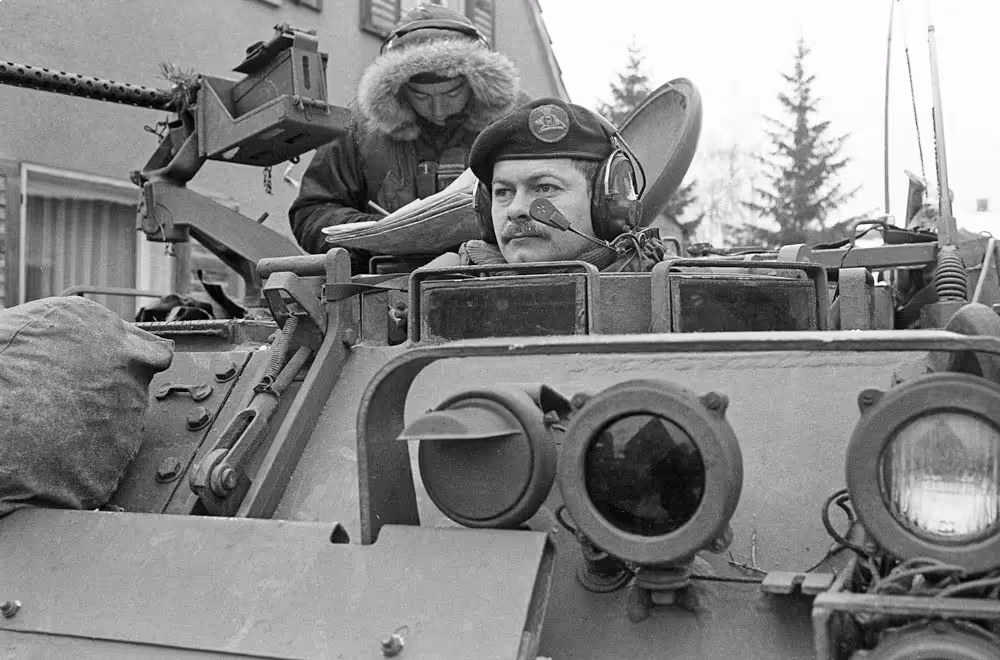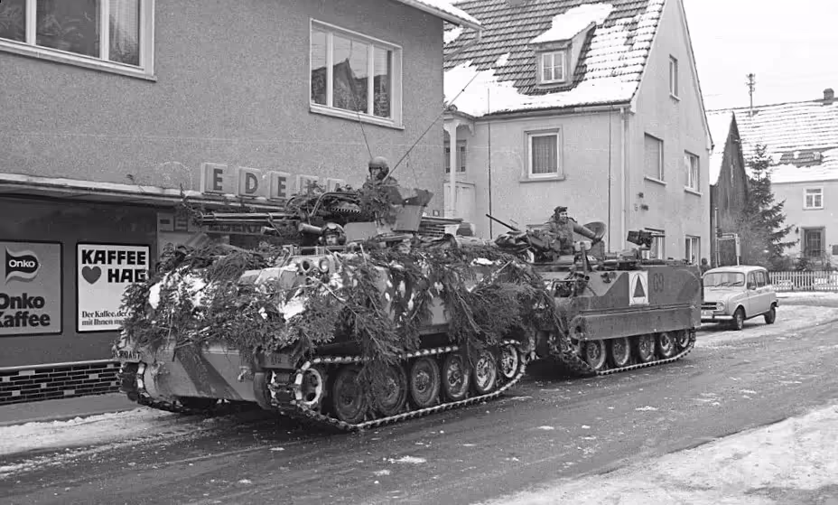 Fallex 77, 4 CMBG M113 C & R Lynx on the move during Ex Carbon Edge as German civilians look on in a German town, September 1977.