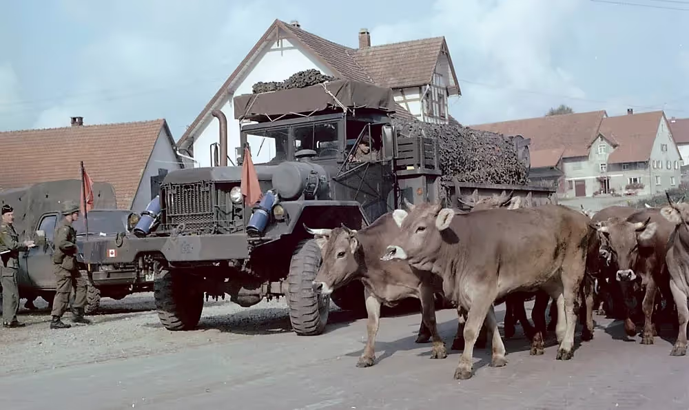 4 CMBG 5-ton fuel bowser, with a herd of cows, Ex Nab Jubilee, Germany, Sep 1977.