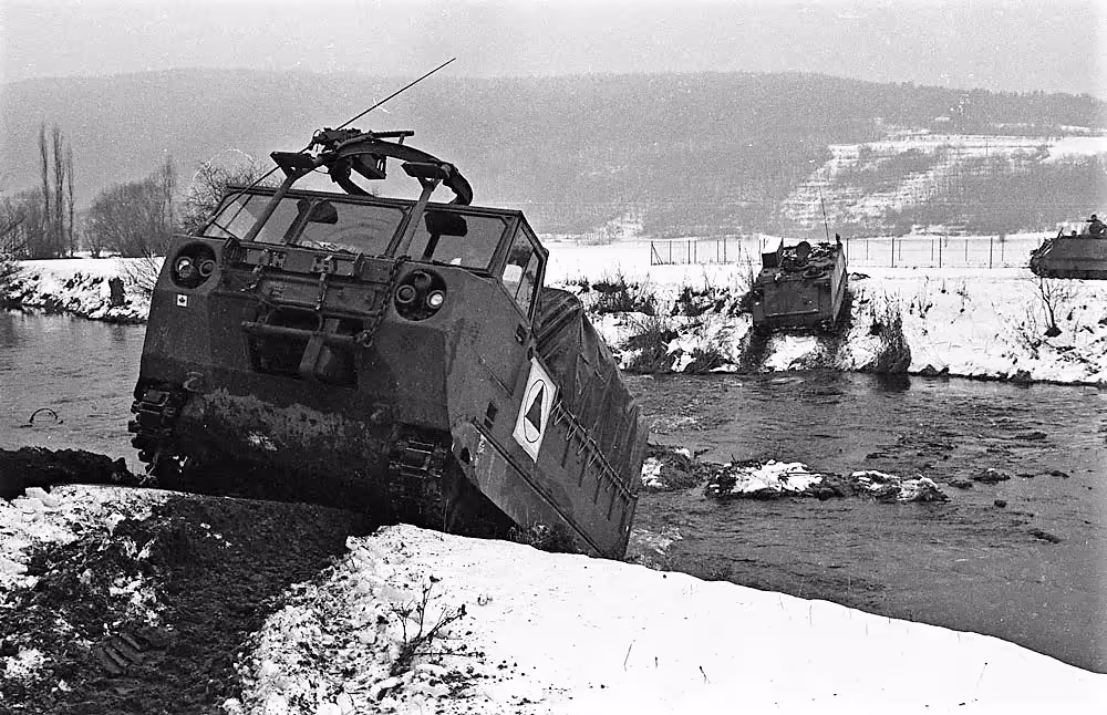 M548 Cargo and an M113 APC, 4 CMBG, crossing a river on Ex Certain Wacht, Germany,19-20 Jan 1977.