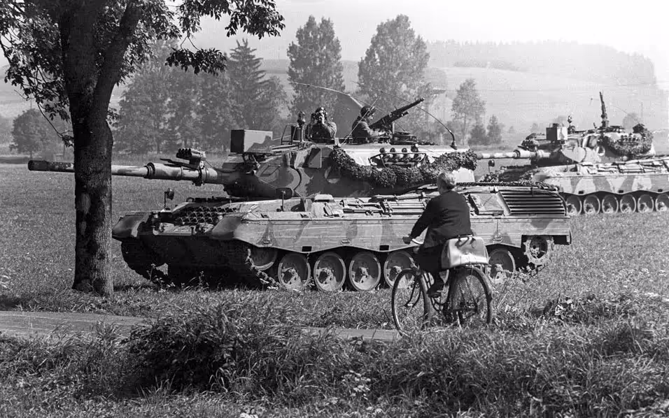 Fallex 77. German woman cycling past German 1A4 Leopard tanks as they roll past during Ex Carbon Edge. 27 September 1977.