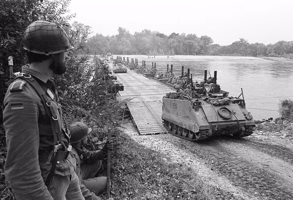 Fallex 78, 3 RCR M113 APC crossing a pontoon bridge, watched by German soldiers, Germany, Sep 1978.