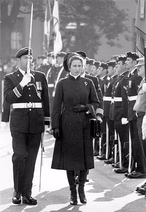HRH Anne, Princess Royal and Colonel-in-Chief of the Communications and Electronics Branch, inspecting the troops during her visit to Lahr, 20 October 1978.  Accompanying HRH is the Commanding Officer Major P.A. Tappin.