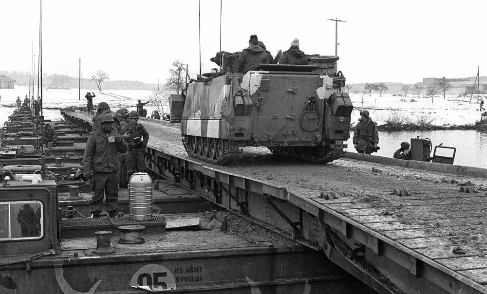 M113, Ex Certain Sentinel, Germany, Main-Donau Canal S of Bamberg, US Army Engineer floating bridge, Feb 1979.