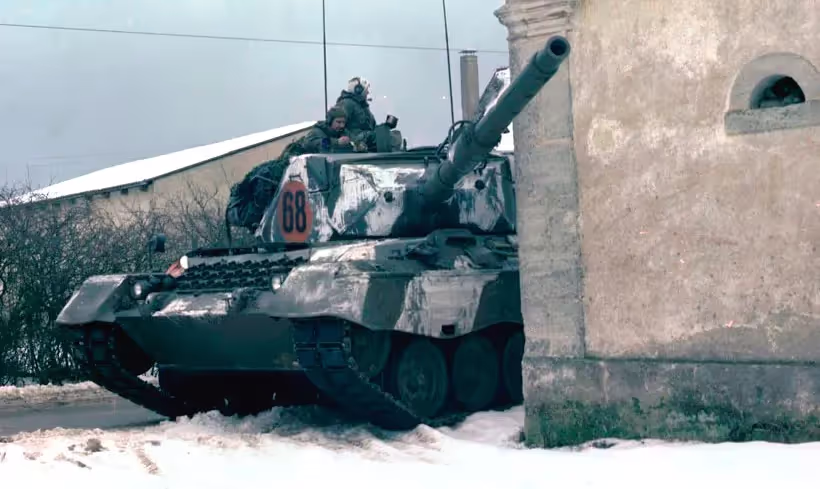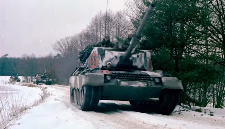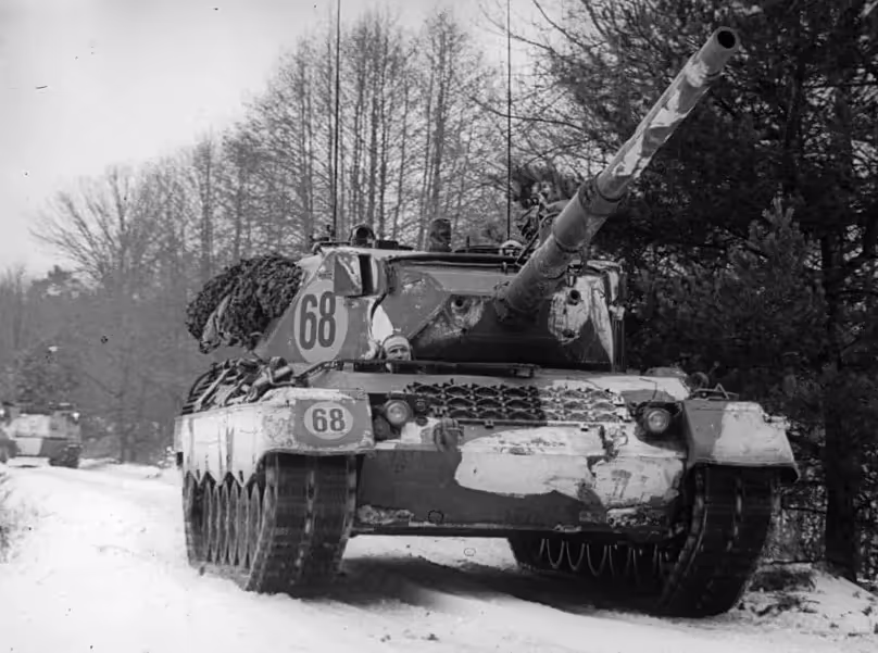 Winter exercise, 4 CMBG Leopard tank, Ex Certain Sentinel, Bavaria, Germany, Feb 1979.