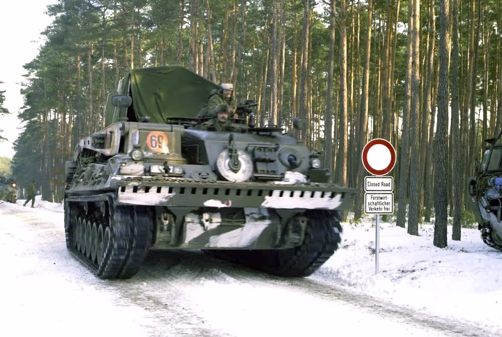 M113 C & R Lynx behind an American M163 Vulcan AntiAircraft Self-Propelled Gun (AASPG) 20-mm six-barrel gun mounted on a modified M113A1 APC, EX Certain Wacht, Germany, 20 Jan 1977.