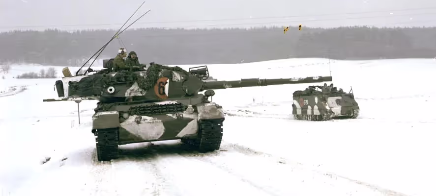 Winter exercise, 4 CMBG Leopard tank and M113 APC, Ex Certain Sentinel, Germany, Feb 1979.