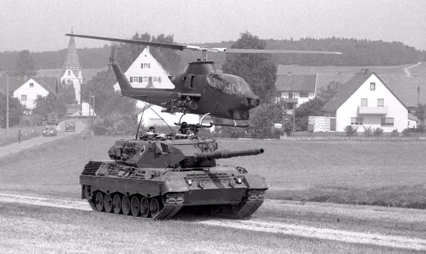 Fallex 79, US Army Bell AH-1 Cobra attack helicopter over a 4 CMBG Leopard tank during Exercise Snakebite, Bavaria, Germany, 5 June 1979.