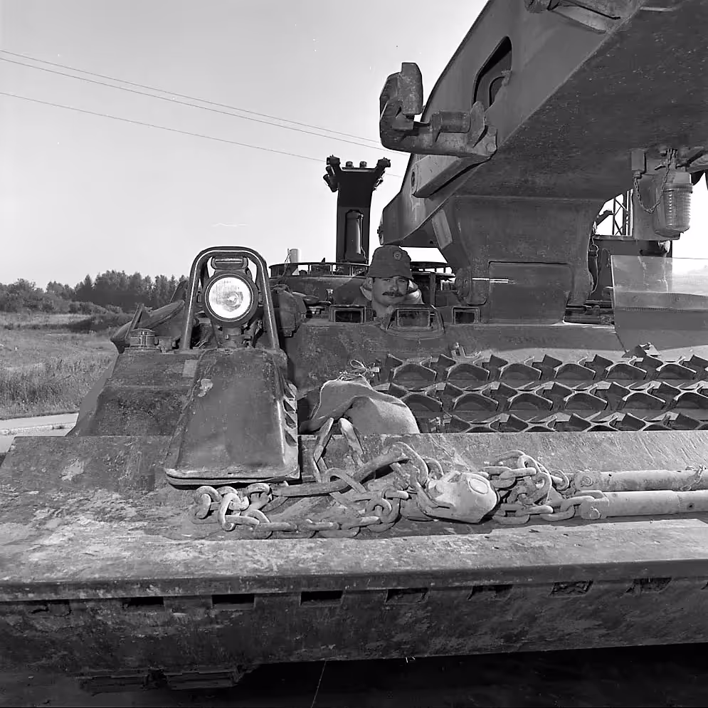Beaver armoured vehicle-launched bridge (AVLB), being loaded by Cpl Moore onto a train at Parsberg, Germany, en route to Rothenberg for Exercise Certain Challenge, Sep 1988.