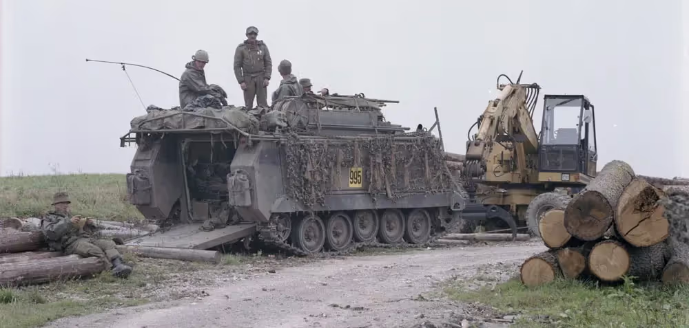 Germany, Fallex 88, 4 CMBG, crewmembers of 4 CER relaxing on and around an M113 APC 11F, near a lumber yard, September 1988. Jim Perez, Dan Bitor, Sergeant Hamilton, and looks like James Simon reading a book. (Rick Morris).
