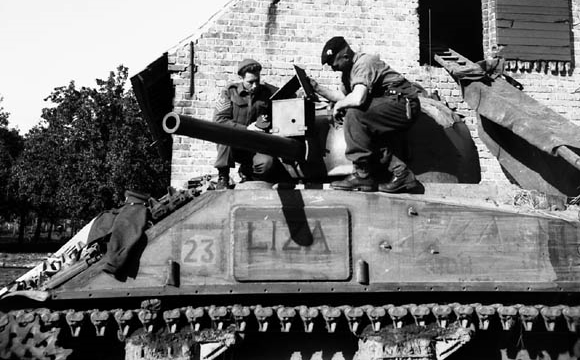 Sergeants L.B. Armstrong and L.H. Stephens mounting a movie camera on a Sherman tank nicknamed ‘Liza‘ of the Canadian Grenadier Guards, Donk, Belgium, 3 October 1944.