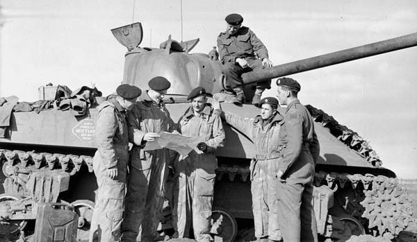 Officers holding an Orders (“O”) Group in front of a Sherman tank of The Governor General’s Foot Guards, Bergen op Zoom, Netherlands, 6 November 1944.