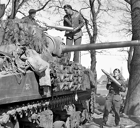 Personnel of The Canadian Grenadier Guards stacking 75-mm shells near the regiment’s positioned Sherman tanks south of Emmerich, Germany, 28 March 1945.