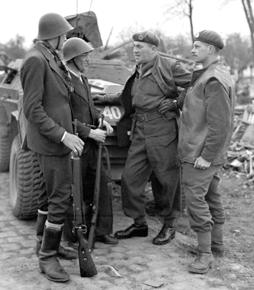 Major David V. Currie (left, with pistol in hand) of The South Alberta Regiment accepting the surrender of German troops at St. Lambert-sur-Dives, France, 19 August 1944. This photo captures the very moment and actions that would lead to Major Currie being awarded the Victoria Cross. Battle Group Commander Major D.V. Currie at left supervises the round up of German prisoners. Reporting to him is trooper R.J. Lowe of “C” Squadron.
