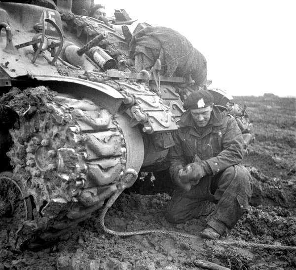 Trooper J.C. McEachern hooking a cable between two Sherman tanks of The South Alberta Regiment, Louisendorf, Germany, 26 February 1945.