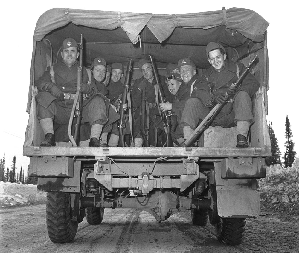 Infantrymen of “B” Company, The Argyll and Sutherland Highlanders of Canada, riding in a captured German truck with German prisoners, St. Lambert-sur-Dives, France, 19 August 1944.