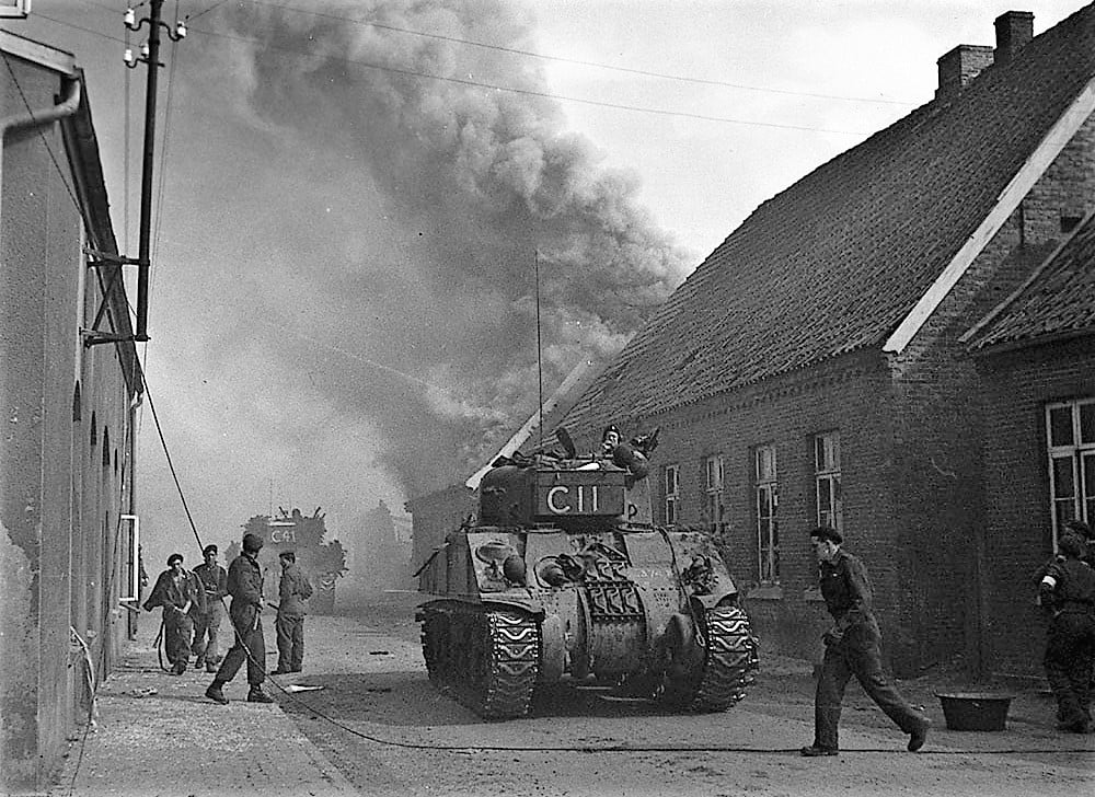 4th Canadian Armoured Division’s drive towards Oldenburg under counter-attack by German Paratrooper Regiment. Street scene showing Canadian troops and tanks, and smoke from burning buildings fills the sky, 10 April 1945.