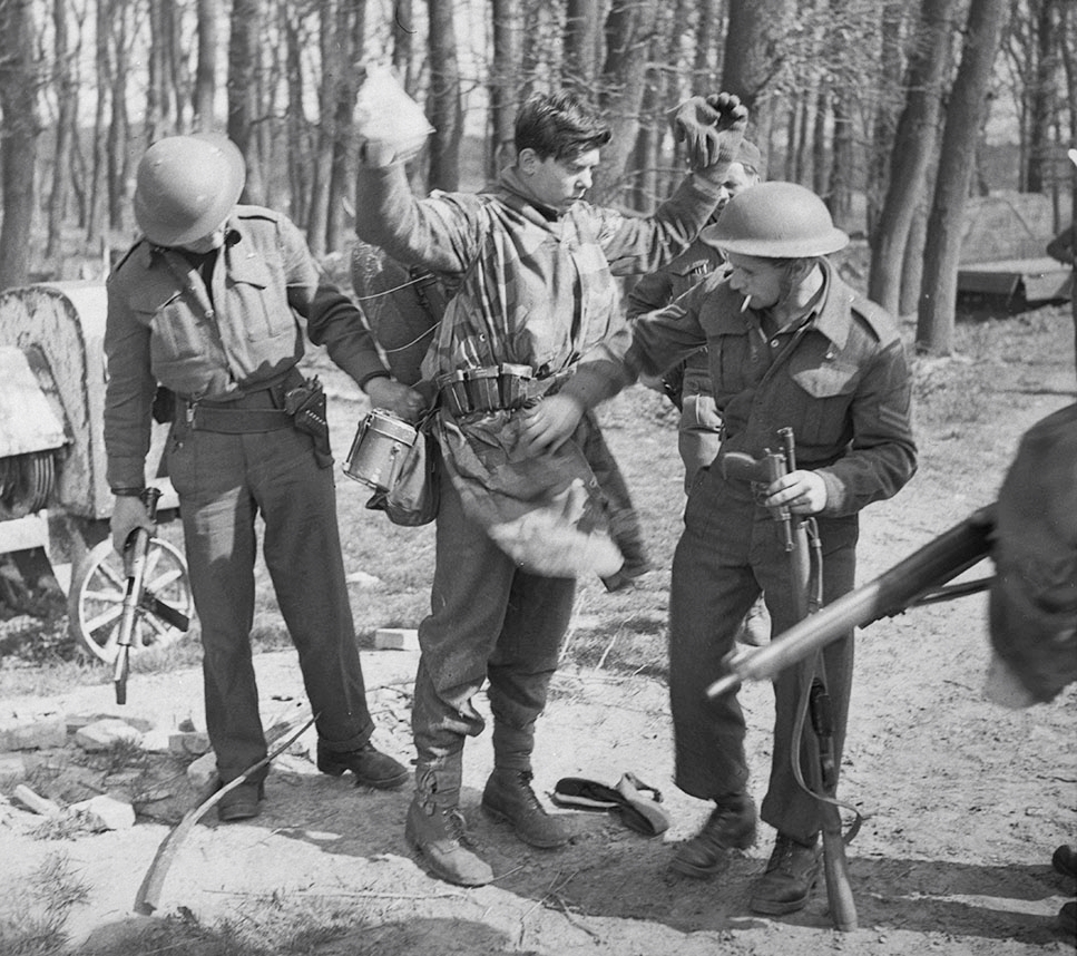 4th Canadian Armoured Division’s drive towards Oldenburg, Germany. After the fall of Sogel, a captured German paratrooper is searched by Canadian troopers, 10 April 1945.