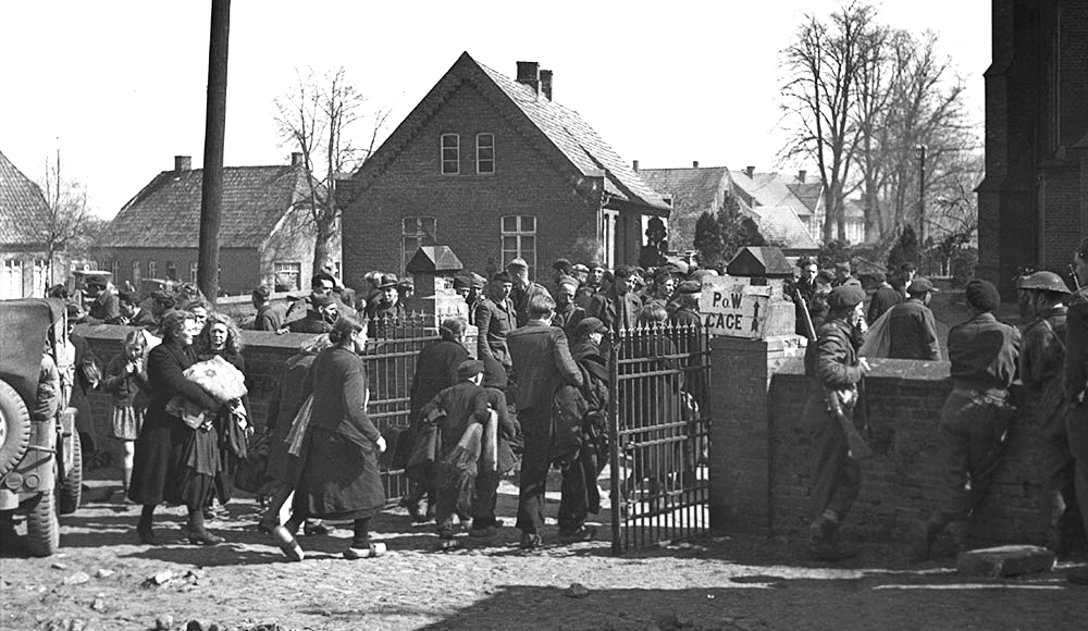 Civilians entering churchyard for interrogation by personnel of the 4th Canadian Armoured Division about German troop movements, 10 April 1945.