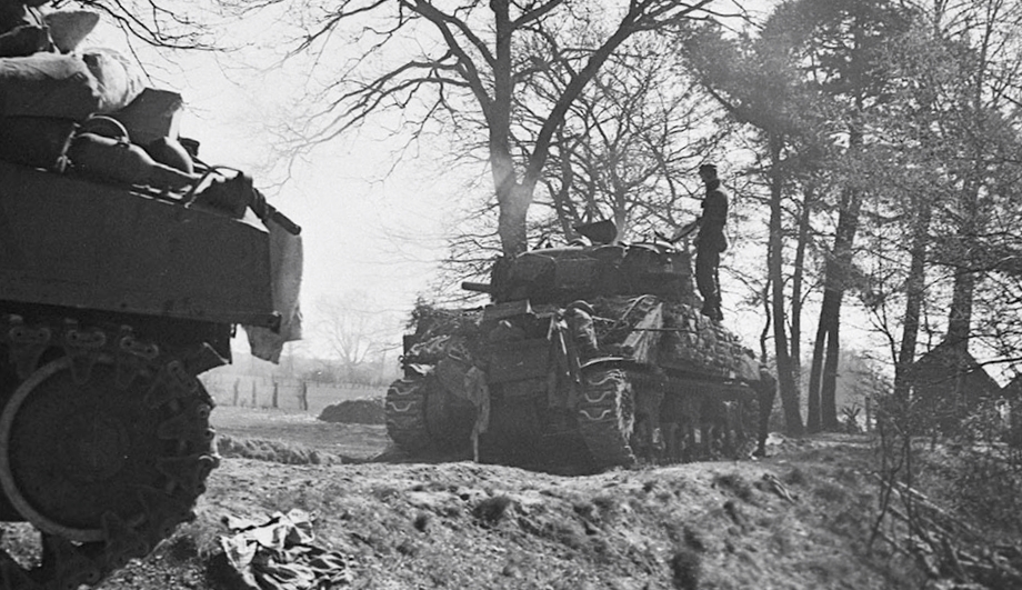 Soldiers of The Argyll and Sutherland Highlanders of Canada are rushed forward in convoys of ‘Kangaroos’, 11 April 1945.