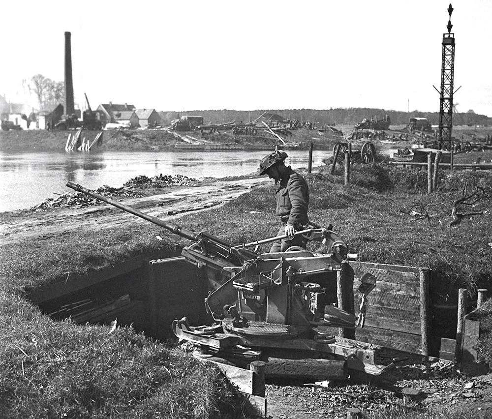 Soldier with the 4th Canadian Armoured Division examining German 20-mm anti-aircraft gun position on the northeast side of the Dortmund-Ems Canal, 8 April 1945.