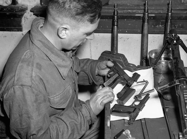 Staff-Sergeant V.H. Dubeau of the 4th Armoured Brigade Workshop, Royal Canadian Electrical and Mechanical Engineers (RCEME), inspecting a Browning pistol, Tilburg, Netherlands, 12 January 1945.