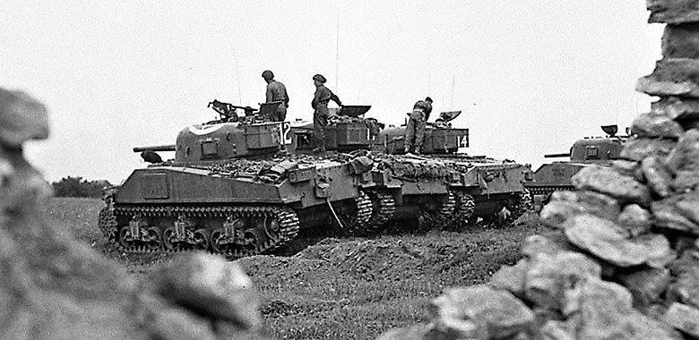 Sherman tanks prepare to move into action in Normandy, 9 July 1944.