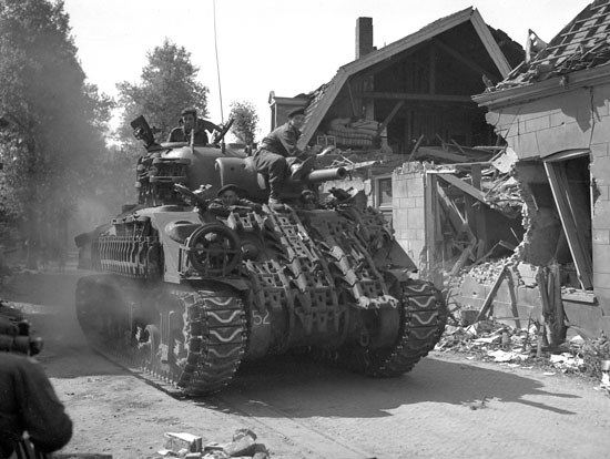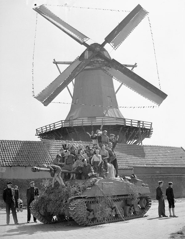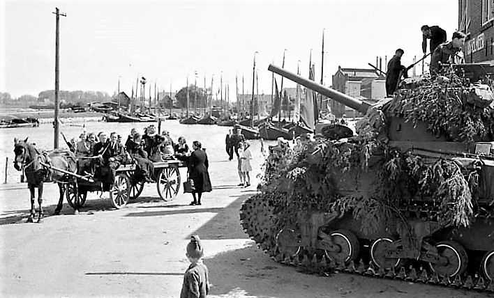 A Sherman V tank of the 8th Princess Louise’s (New Brunswick) Hussars en route to the Zuider Zee passing through Putten, Netherlands, 18 April 1945.