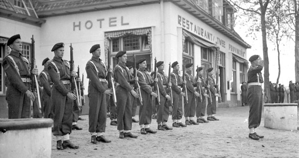 Troopers of the 8th Princess Louise’s (New Brunswick) Hussars presenting arms upon the arrival of Lieutenant-General G.G. Simonds, Groningen, Netherlands, 12 November 1945.