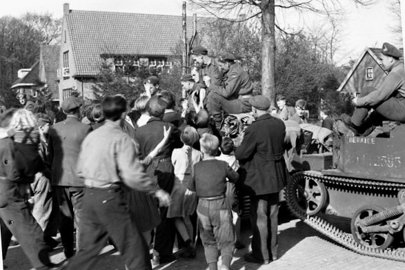 Civilians turn out to greet the 5th Canadian Division Perth Regiment and Lord Strathcona Horse tanks as they reach the Zuider Zee, 19 April 1945.