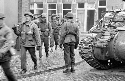 Infantrymen of the Perth Regiment advancing through Arnhem, Netherlands, 15 April 1945.