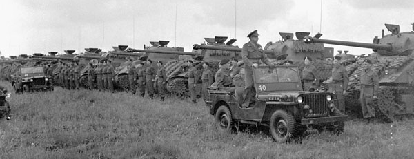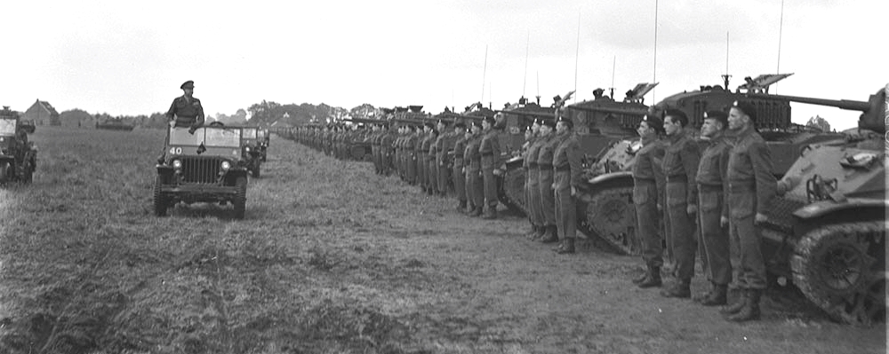 Inspection of the 5 Canadian Armoured Division by General Crerar, GOC in C, 1st Canadian Army, Eelde airport, Netherlands, 23 May 1945.