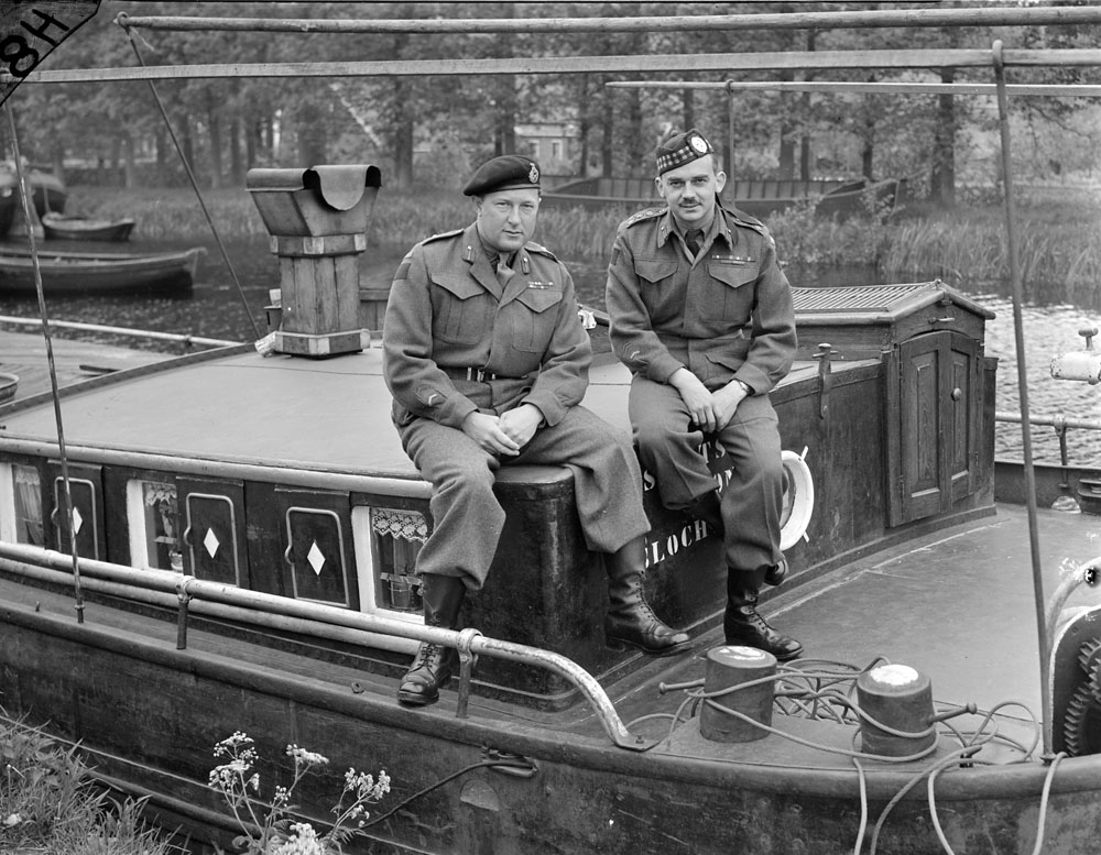 Major-General B.M. Hoffmeister and with another officer sitting on a Dutch Canal boat, 16 May 1945.