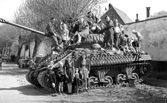 Dutch children riding on a Sherman tank of Lord Strathcona’s Horse (Royal Canadians), Harderwijk, Netherlands, 19 April 1945.