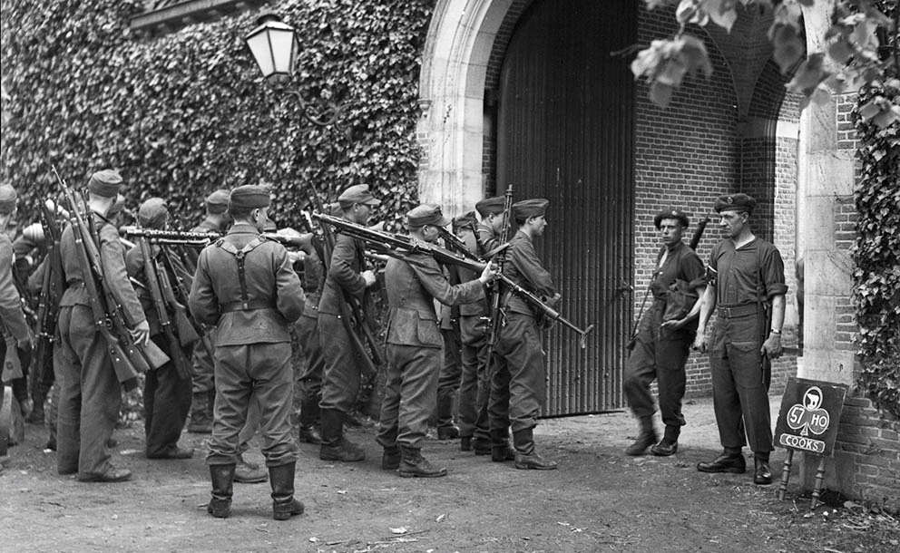 German soldiers entering a concentration area to be disarmed by soldiers of the 1st Canadian Corps, Amsterdam, Netherlands, 9 May 1945.