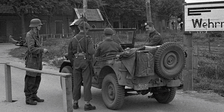 Entrance to the German garrison base, where German soldier and Canadian troops check and accept soldiers wishing to surrender, 11May 1945.