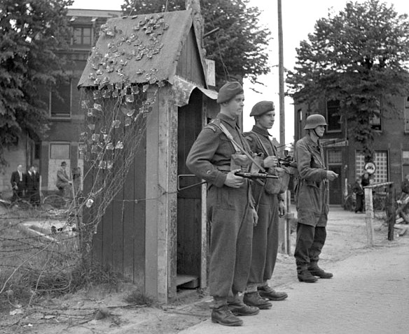 Privates W.R. Hill and M.A. Gammon of 1st Canadian Corps on guard duty with a German soldier, also on guard duty, at the German garrison, Ijmuiden, Netherlands, 11 May 1945.