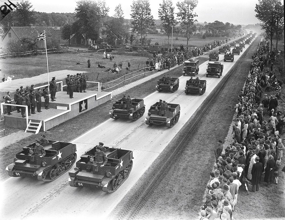 The Westminster Regiment passes the saluting base during Gen. H.D.G. Crerar’s review at Eelde airport, 23 May 1945.