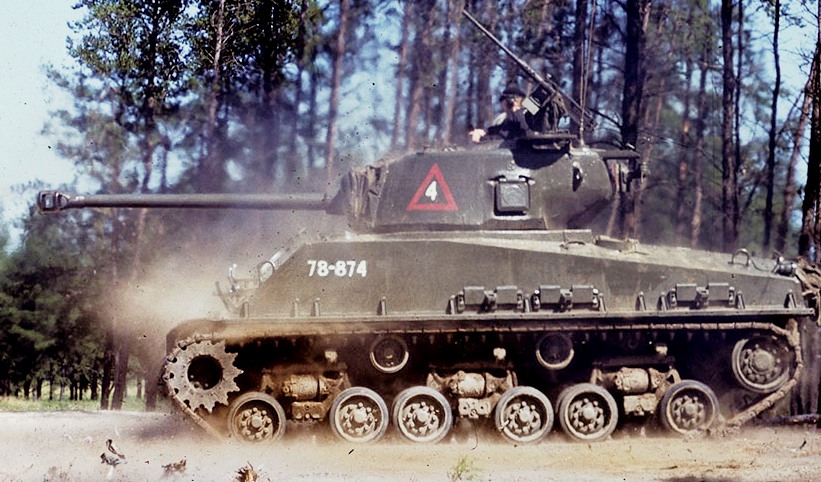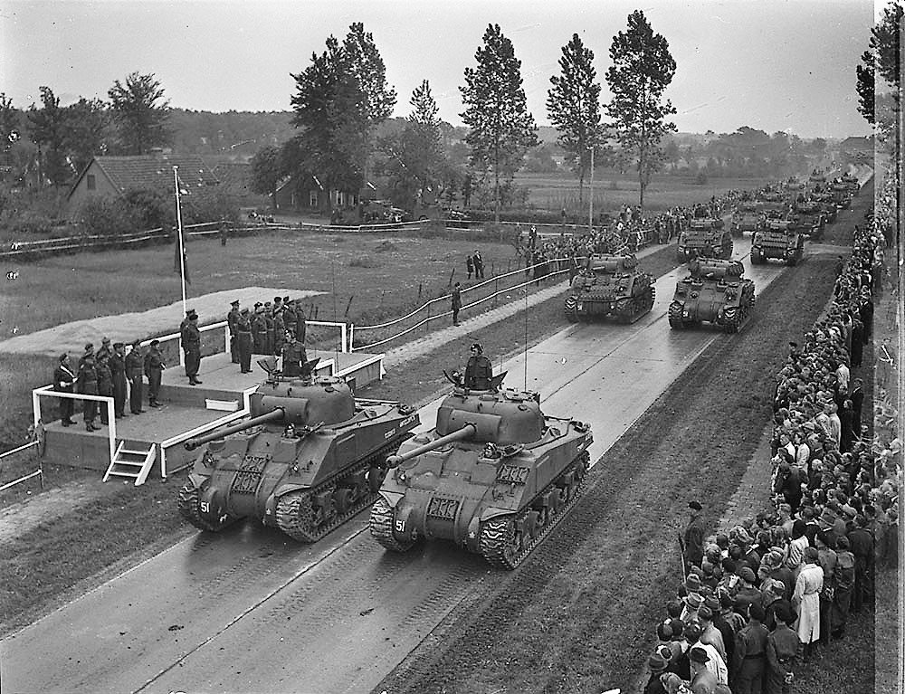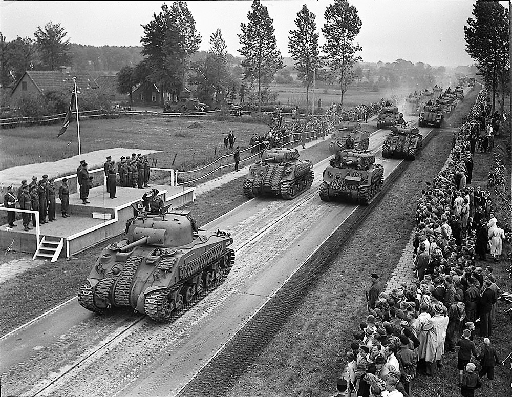 Sherman M4A2 (75-mm) tank, 5th Canadian Armoured Division, 8th Princess Louise (New Brunswick) Hussars, en route to the Zuider Zee passing through Putten, Holland, 18 April 1945.