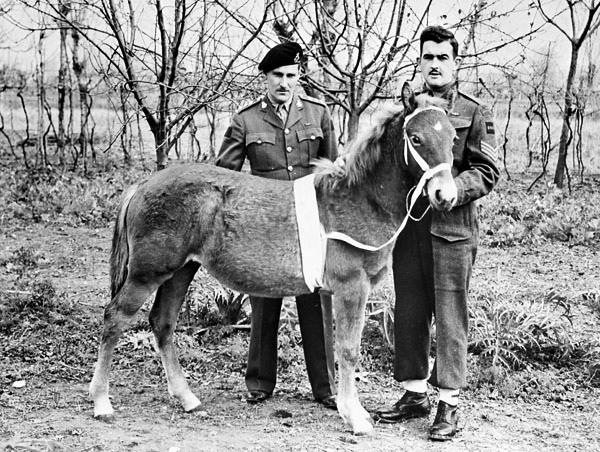 “Princess Louise”, the mascot of the 8th Princess Louise’s (New Brunswick) Hussars, who was found badly wounded after the battle of Coriano and nursed back to health by members of the regiment. Italy, 1944.