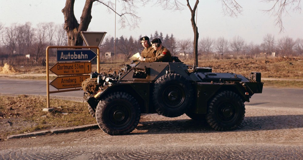 8th Canadian Hussars Ferret Scout Car on patrol during an exercise in Northern Germany, ca 1961.