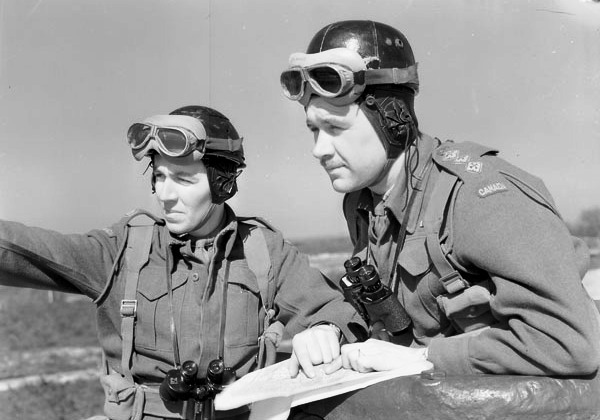 A crew commander of the 8th Princess Louise’s (New Brunswick) Hussars in the hatch of his Sherman tank giving firing orders to his gunner during a predicted mass tank firing exercise, Italy, 2 March 1944. The twin ring on the left are a sight added to the front “bladesight” which was used for firing indirect in a firebase position. The sight has crosshairs added front and back to aid int the direction of fire. Used in Tollo, Italy, 4 February 1944. There are 4 other photos from the same photographer from this shoot.