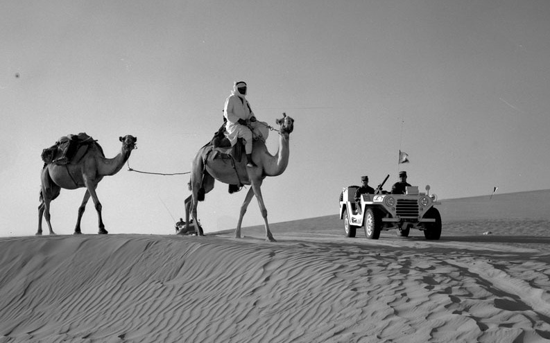 MUTT M-151 Truck, Utility, 1.25-ton, 4 X 4 Jeep (G838), with camels during 8th Canadian Hussars Reconaissance Patrols of the Sinai desert, 11 Aug 1964.