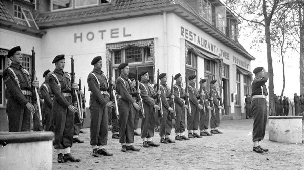 Troopers of the 8th Princess Louise’s (New Brunswick) Hussars presenting arms upon the arrival of Lieutenant-General G.G. Simonds, Groningen, Netherlands, 12 November 1945.