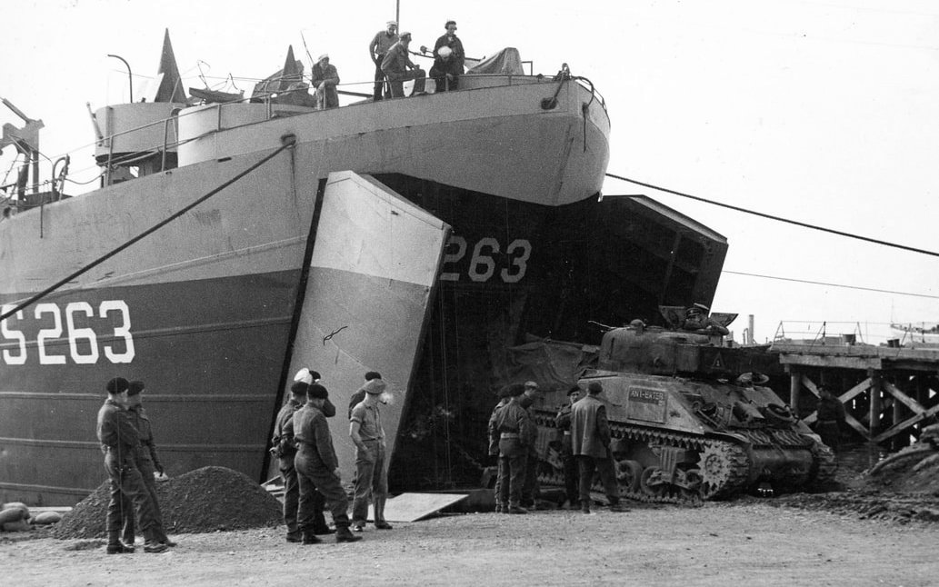 Operation Goldflake, 1st Canadian Corps with Sherman tanks of the 8th New Brunswick Hussars being loaded on Landing Ship Tank (LST) S263.