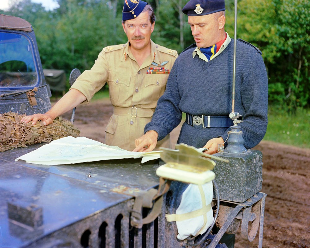 LCol Jack Eaton leading his regiment, the 8th New Brunswick Hussars, past the saluting base in the review and marchpast of the 5 Canadian Armoured Division given by GOC in C of 1st Canadian Corps. General Crerar, Eelde airport, Netherlands, 23 May 1945.