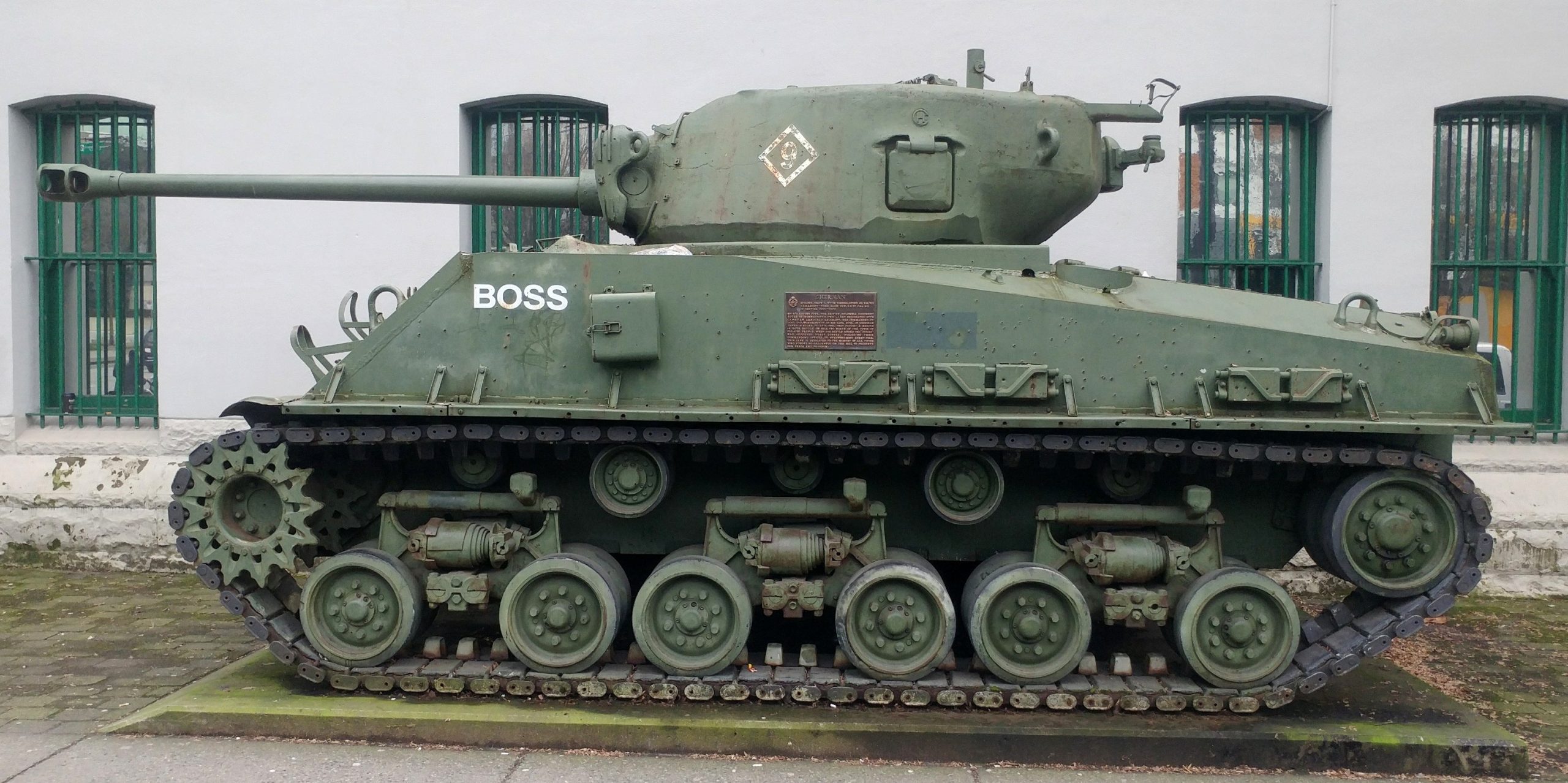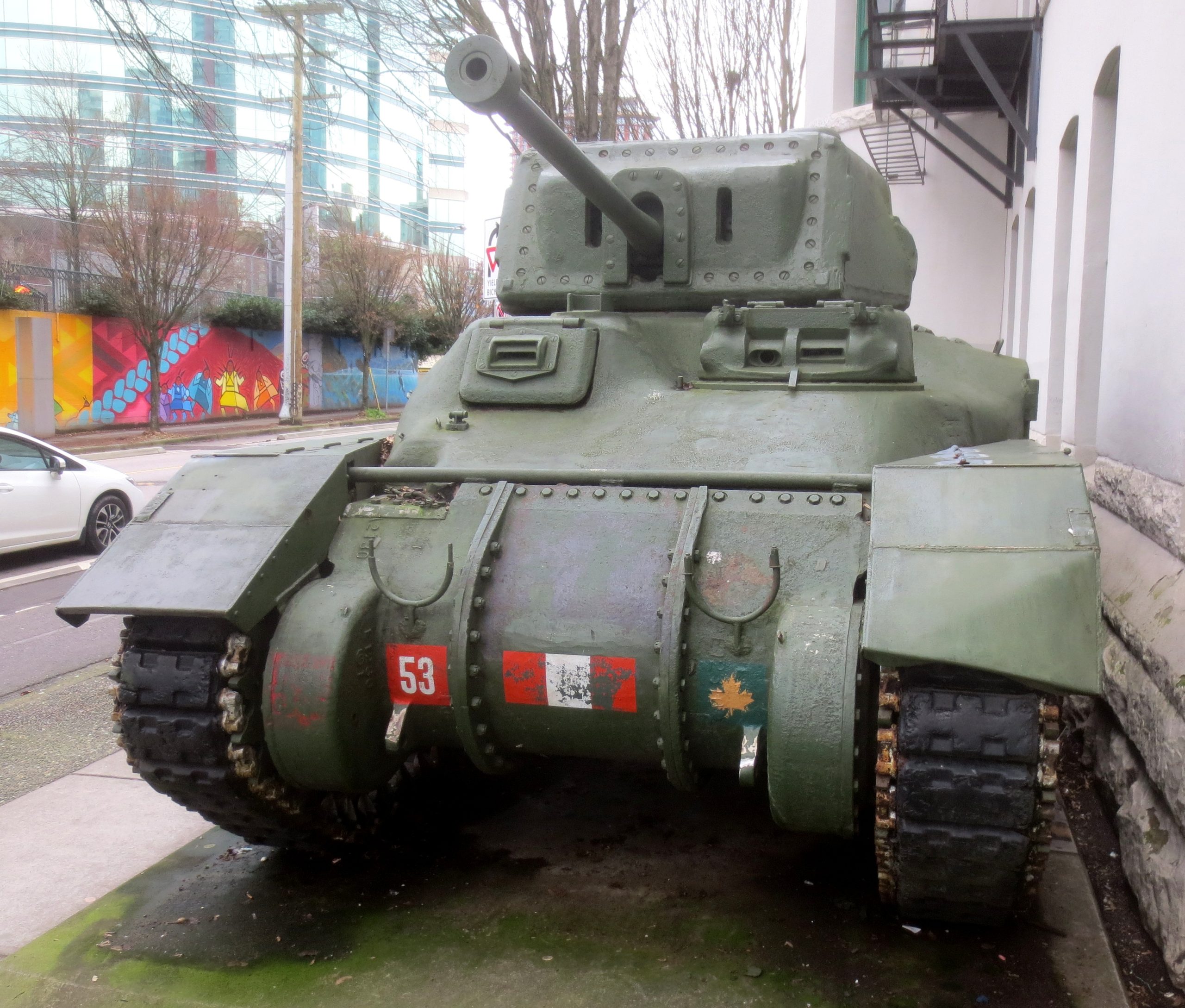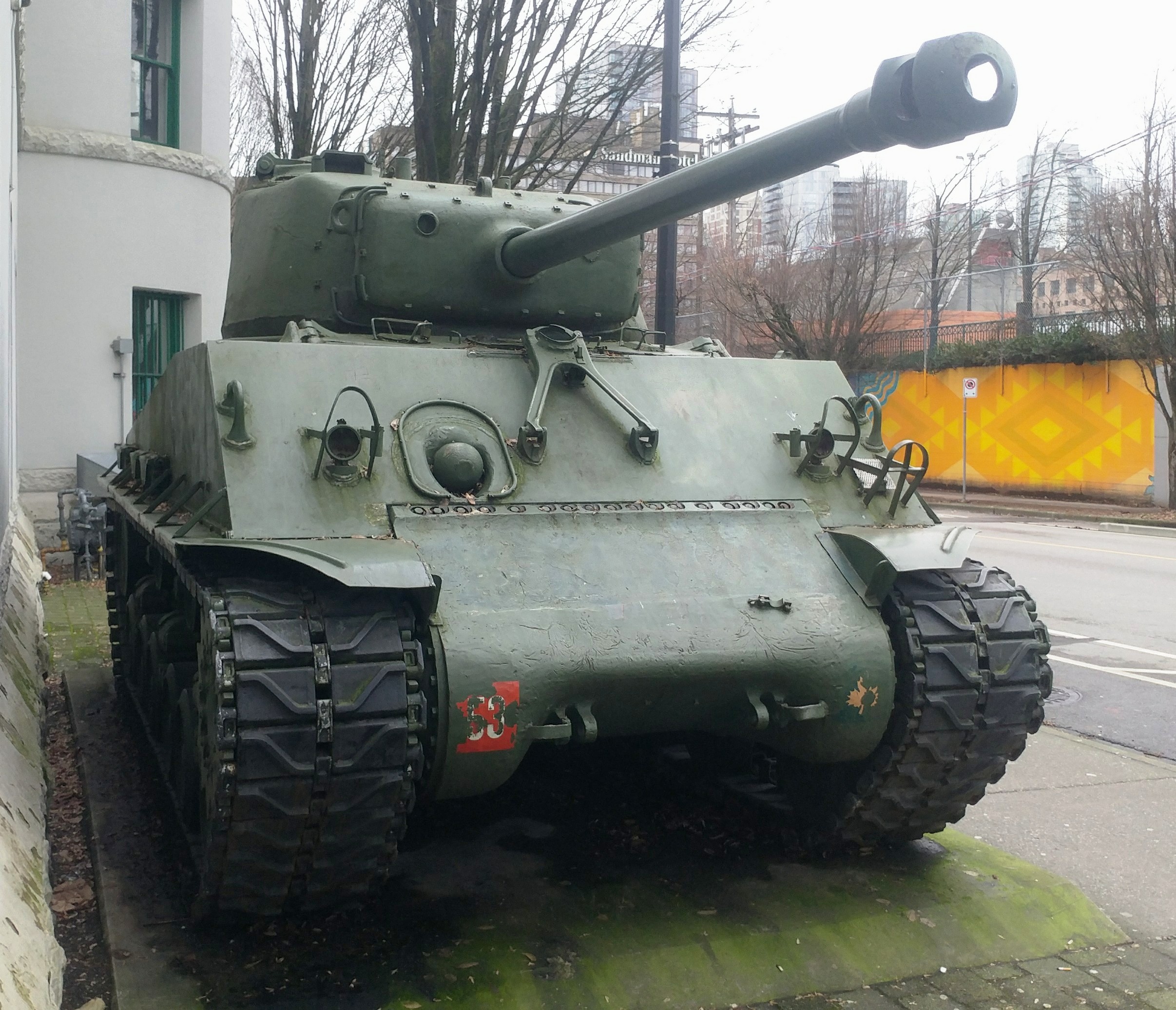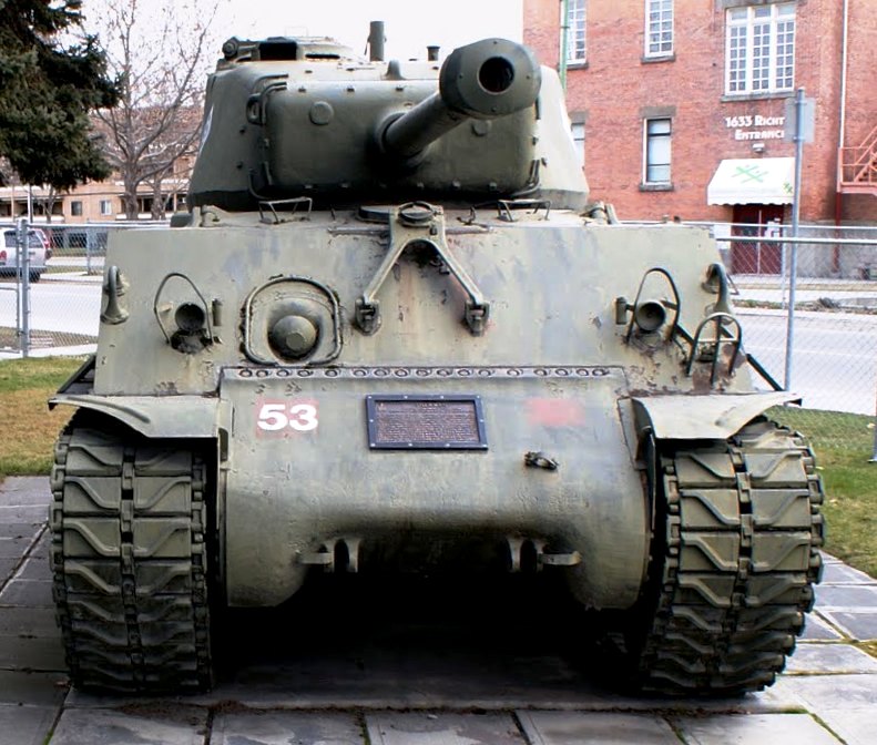 Canadian Medium TankM4A2(76)W HVSS Sherman “Easy 8”, DND No. 69192, built by Fisher, Reg. No.30129671, No. 53, “Boss”, Beatty Street Drill Hall, 620 Beatty Street.