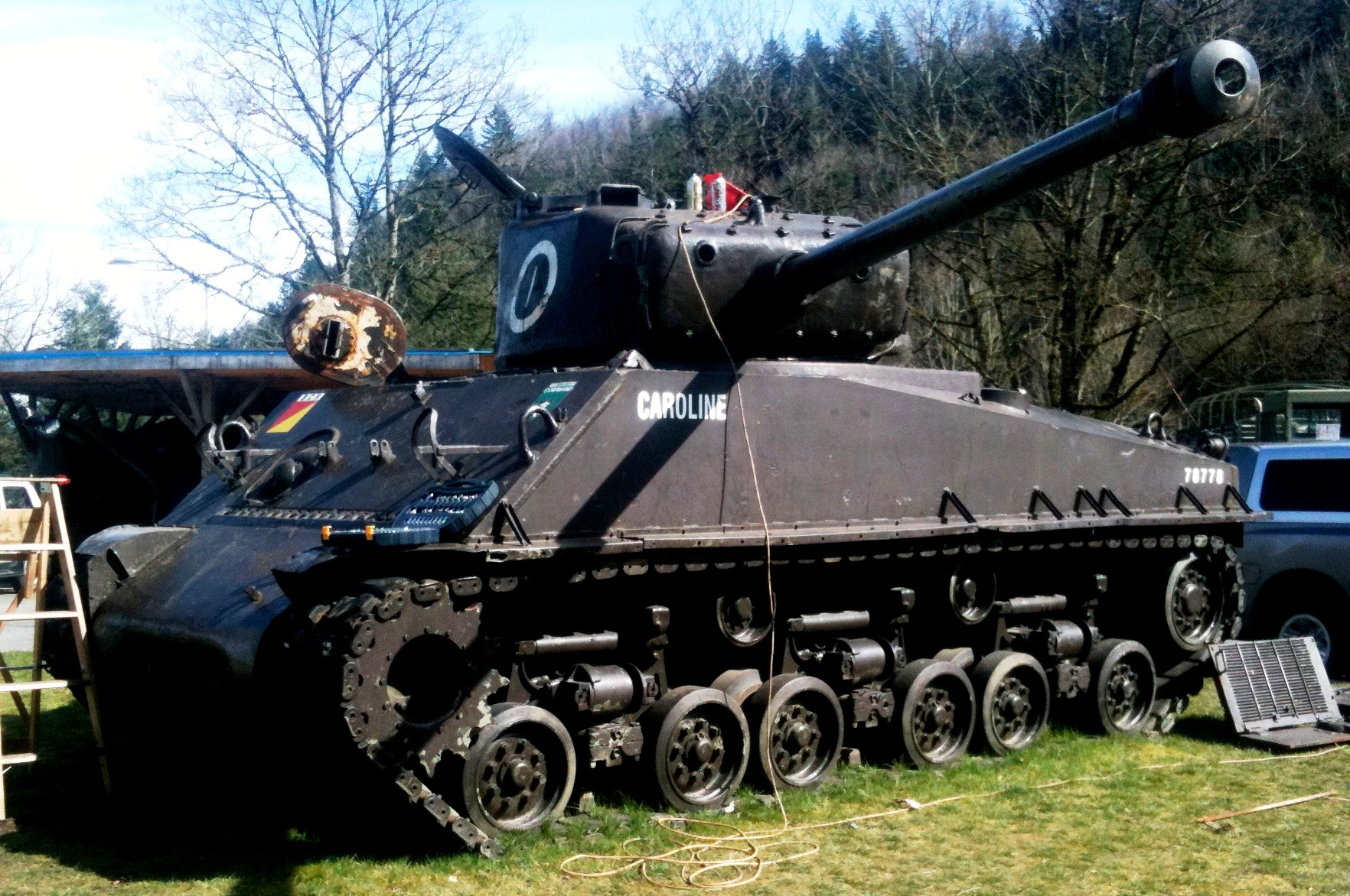Canadian Medium Tank M4A2(76)W HVSS Sherman “Easy 8”, DND No. 69301, built by Fisher, Reg. No.30129780, “Caroline”. This tank still runs. It belongs to the 39th Combat Engineers Regiment and is currently on display at the Armoury (Old Area Support Unit facility) on Keith Wilson Road.