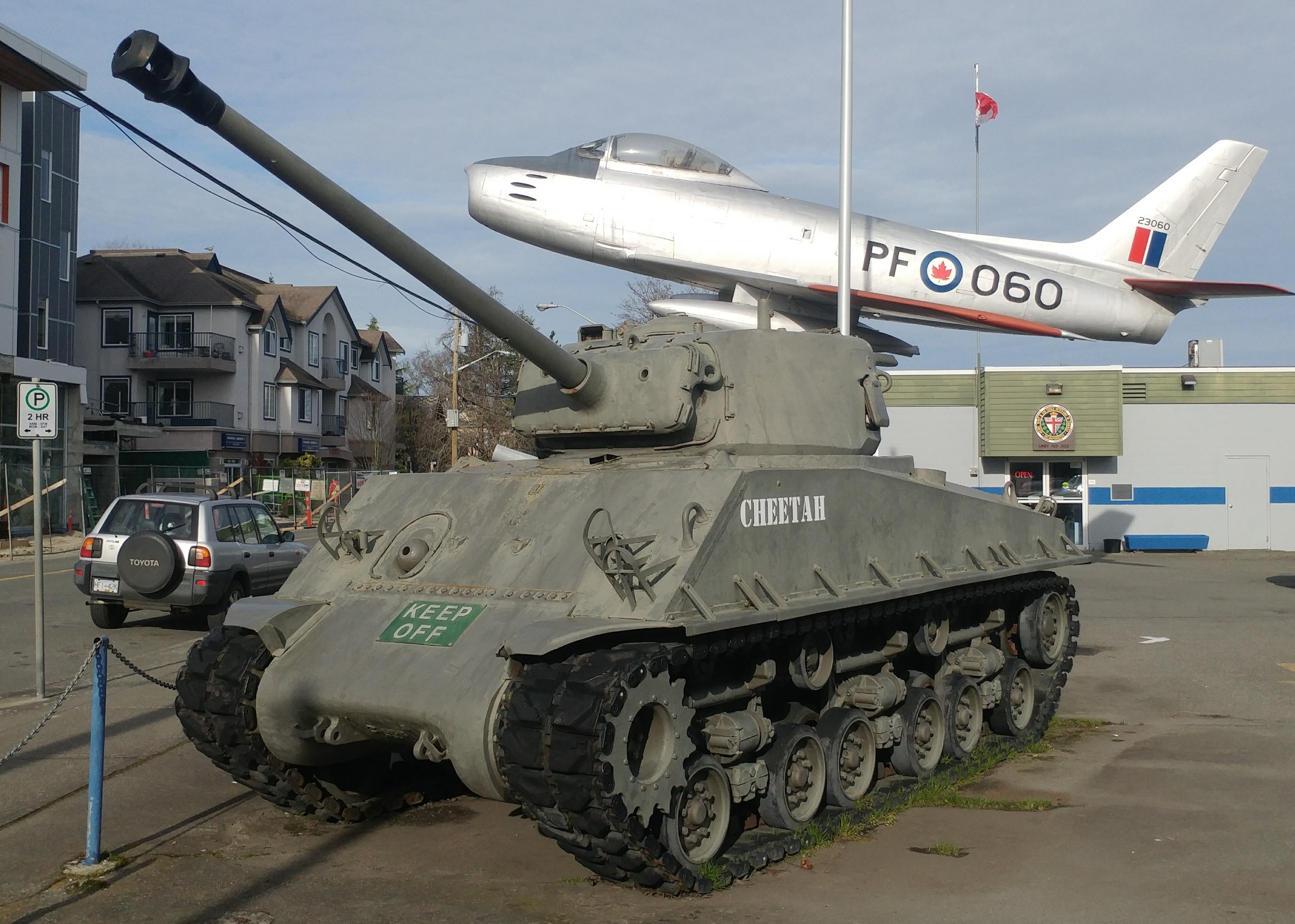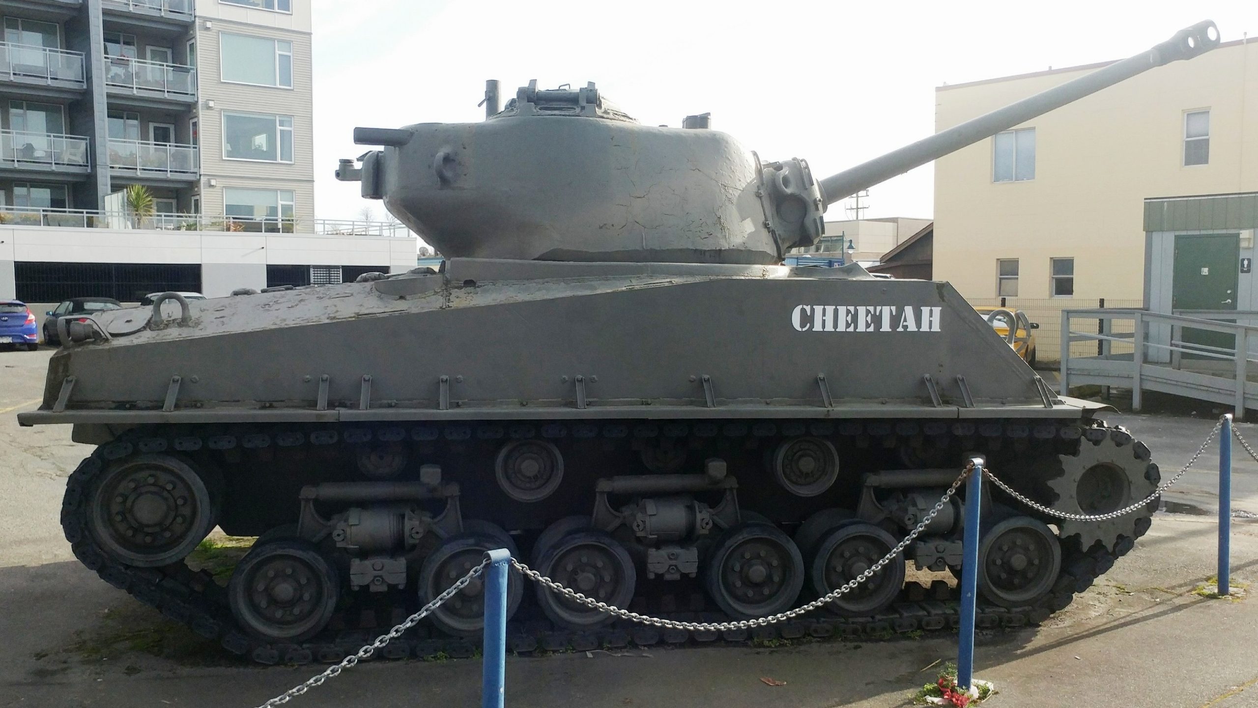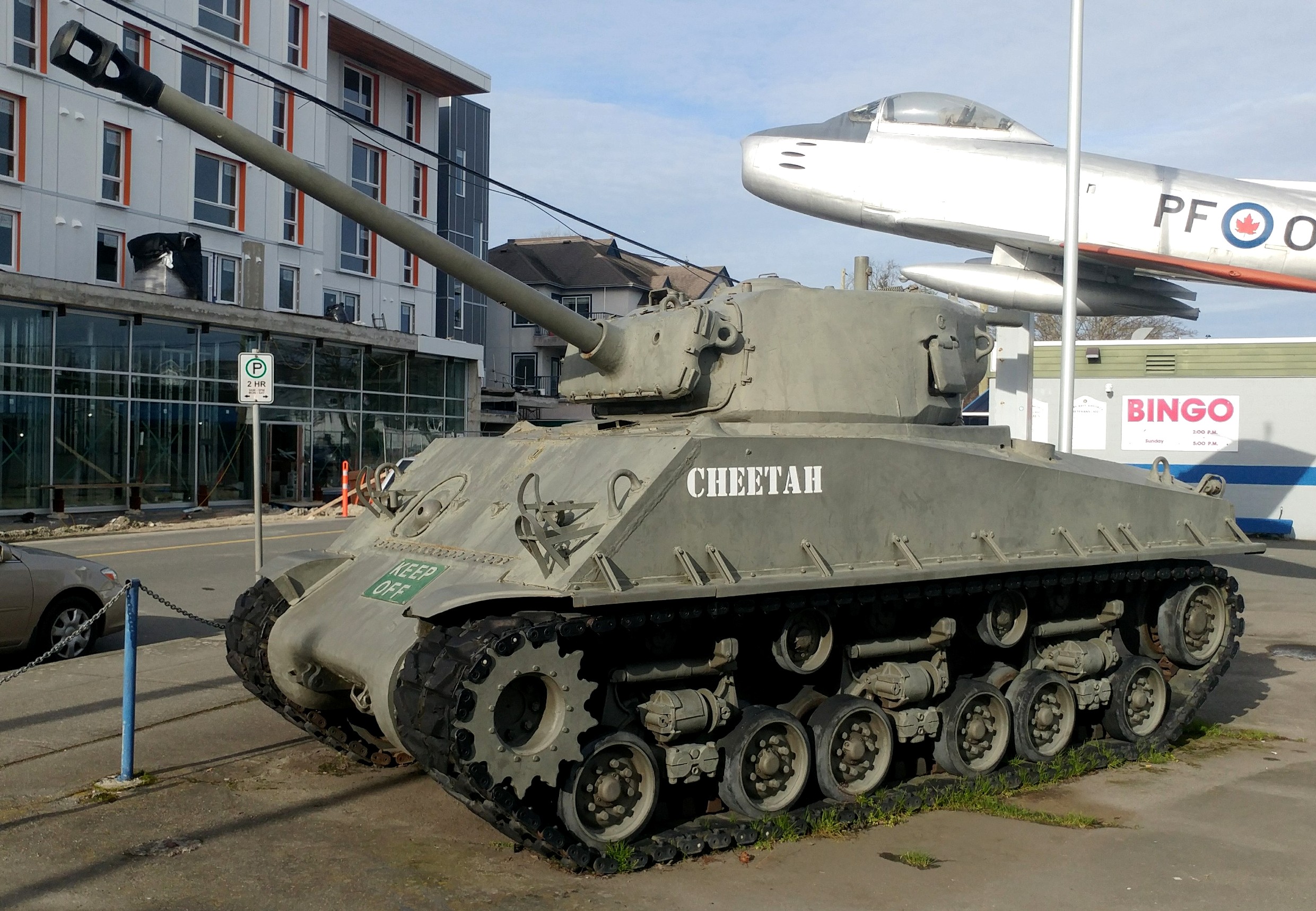 Canadian Medium Tank M4A2(76)W HVSS Sherman “Easy 8”, DND No. 69087, built by Fisher, Reg. No. 30129566, “Cheetah”, Army, Navy & Air Force (ANAF) Hall, Unit No.302, 9831 4th St.